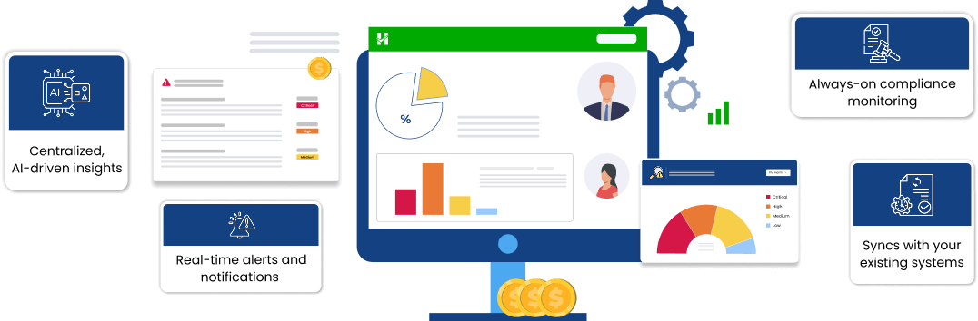 Our AI-powered engine continuously monitors activities across people, finance, and compliance workflows, identifying warning signs that are often missed by traditional checks.